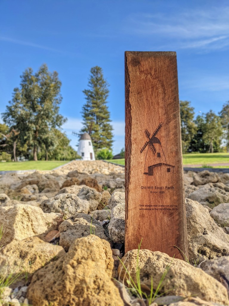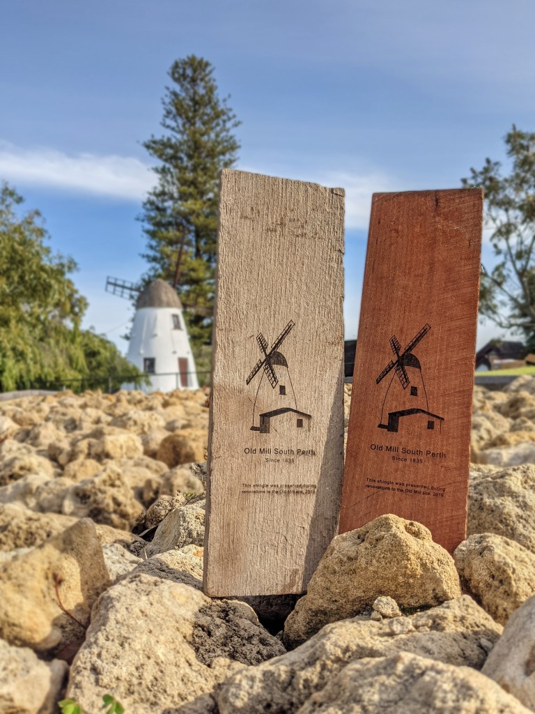 Recently we had the wonderful opportunity to create a Memento for the leaving CEO of South Perth with an authentic roof shingle of South Perth’s Old Mill. The old wood shingles were treated and superimposed with a graphic image which we created from the iconic Old Mill. It turned out looking great and was very well-received.